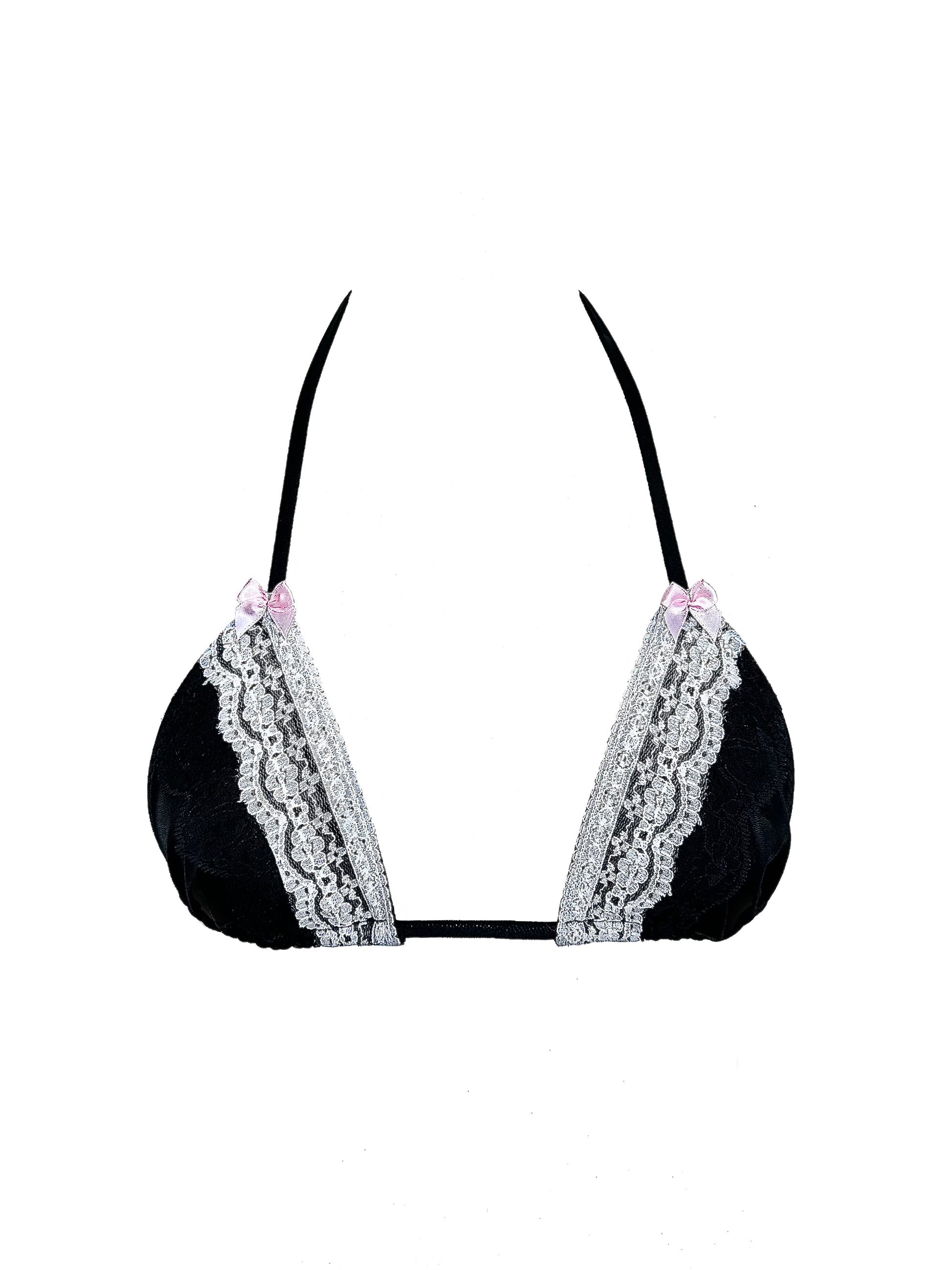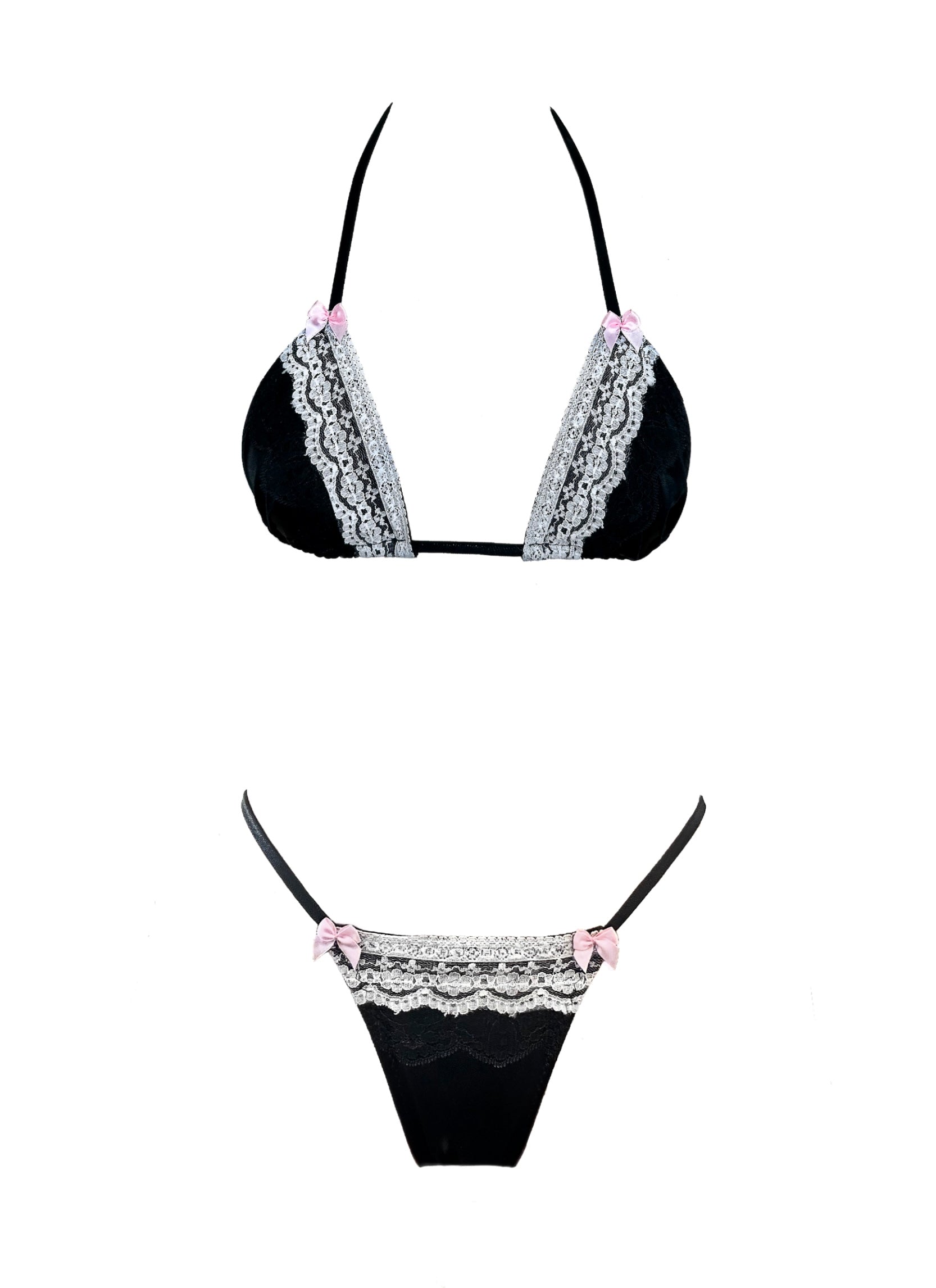 The Laced black metallic bikini with pink satin bows includes a double layered lace trim on the edges. Perfect for tanning with it’s minimalist design, hugging your curves and creating a flattering silhouette. The shimmering black material adds an edge to your beach look, while minimizing tan lines.